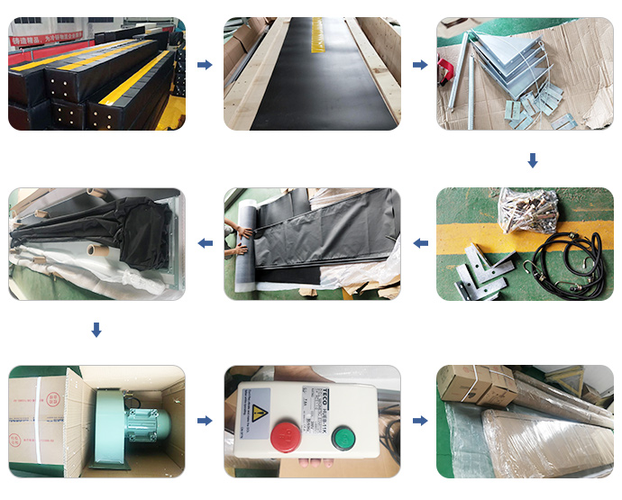 有頂部密封柱和兩個(gè)側(cè)密封柱。該材料為氯丁橡膠合成織物,密封柱為連續(xù)的圓柱形,由外部鼓風(fēng)機(jī)連續(xù)充氣,各部分設(shè)有平衡孔。因此,整個(gè)工作狀態(tài)將緊緊地包裹著卡車(chē)車(chē)廂。達(dá)到密封效果。